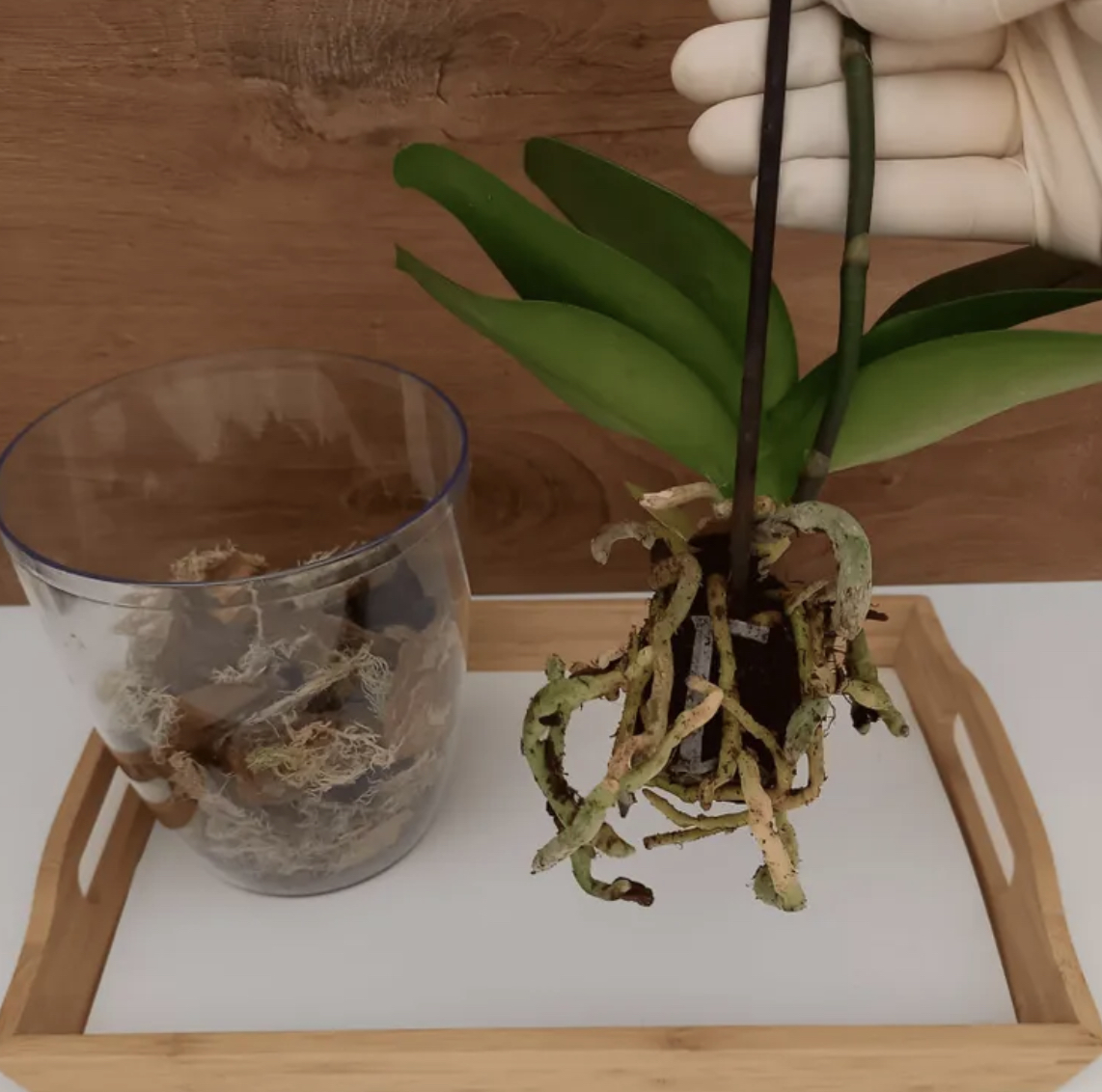- Пересаживать растение можно через один-два дня, когда она адаптируется после переезда. За это время подготовьте все, что может понадобиться для пересадки: субстрат из коры и мха-сфагнума, горшок, секатор, перчатки, препараты от болезней и вредителей (фунгициды, акарициды).